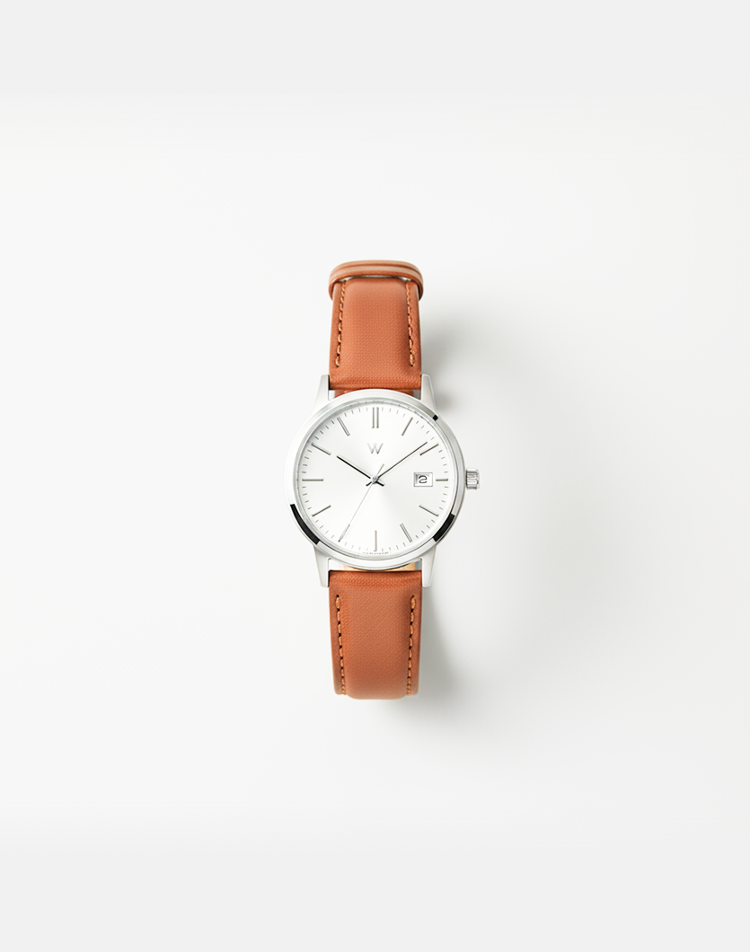 Elegancki zegarek o ponadczasowym designie, który łączy minimalistyczną tarczę w kolorze srebrnym z brązowym skórzanym paskiem. Subtelne indeksy godzinowe i smukłe wskazówki podkreślają jego klasyczny charakter, a wbudowany datownik dodaje praktyczności. Idealny zarówno do codziennych stylizacji, jak i bardziej formalnych okazji.